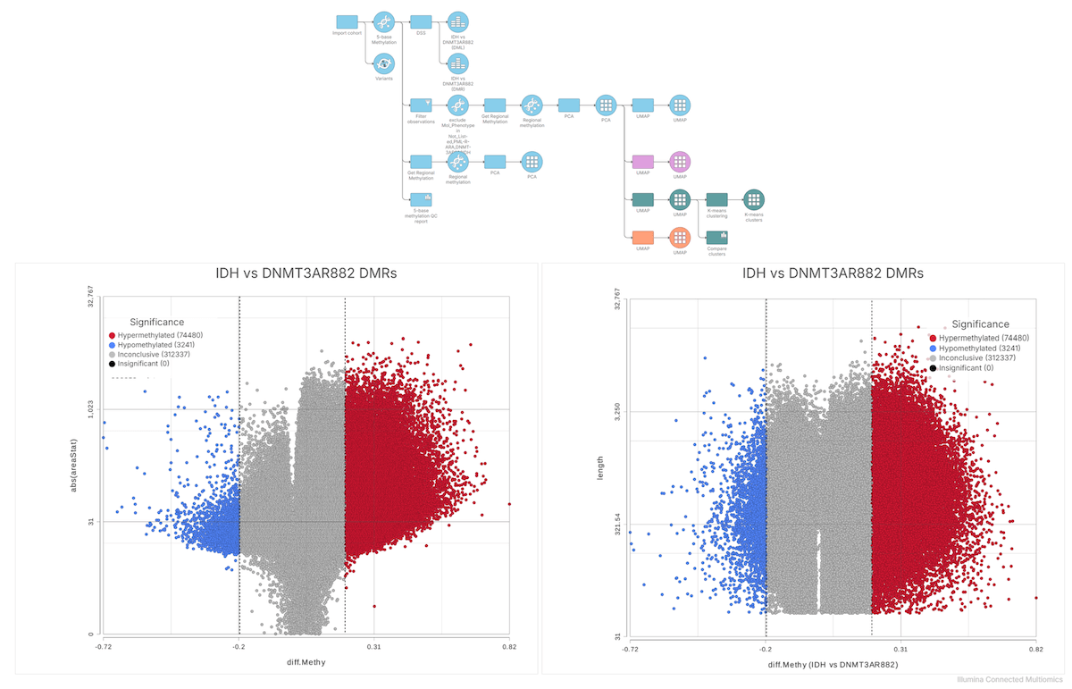 该平台将接收DRAGEN的输出数据,并创建多样本数据结构,从而简化队列水平的分析。这种结构简化了一些常见任务,如数据质量过滤、无监督聚类分析和差异甲基化分析。以下代表性分析工作流程展示了急性骨髓性白血病(AML)患者队列的Connected Multiomics功能。后续一篇博客文章将更详细地展示Connected Multiomics。