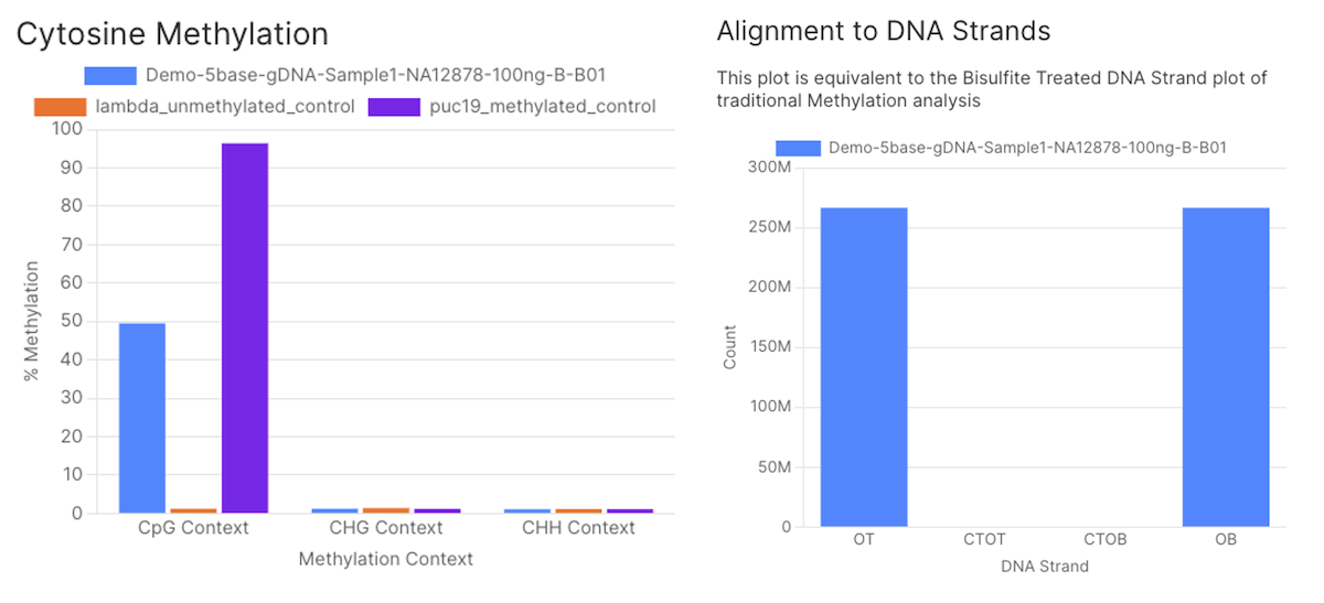 (左图)在哺乳动物基因组中,CpG结构的总体甲基化比例很高(40–60%),而非CpG结构未甲基化。加标甲基化和未甲基化对照基因组在CpG结构中显示出预期的甲基化水平。(右图)等比例定位到预期DNA链OT或OB的read。