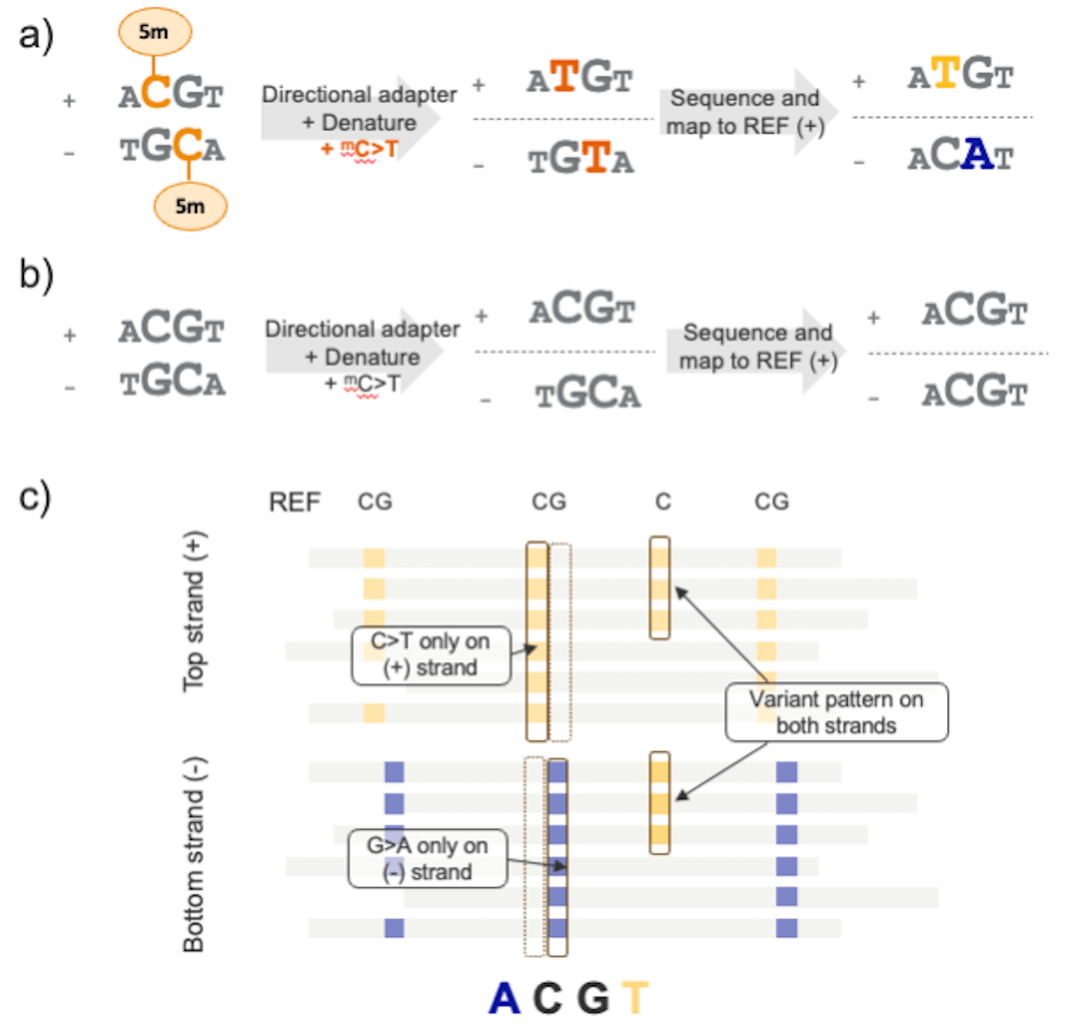 (B)未甲基化等位基因A-C-G-T的测序与标准DNA文库制备类似。匹配的等位基因碱基同时存在于(+)和(−)链上。