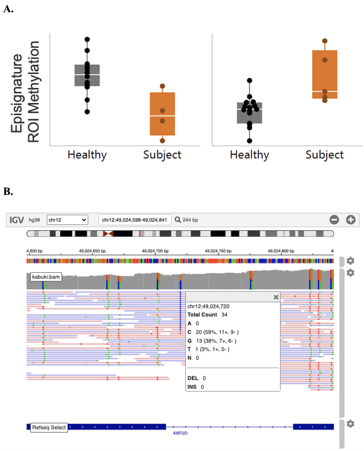 您可以在基因组浏览器中检测比对上的read,以便收集有关目标区域的变异和甲基化状态的信息。例如,在一名Kabuki综合症患者中,我们发现其KMT2D基因存在一处变异(chr12:49,024,720 G>C),并在已知与Kabuki综合症相关的目标区域观察到了明显的表观特征或高/低甲基化变化