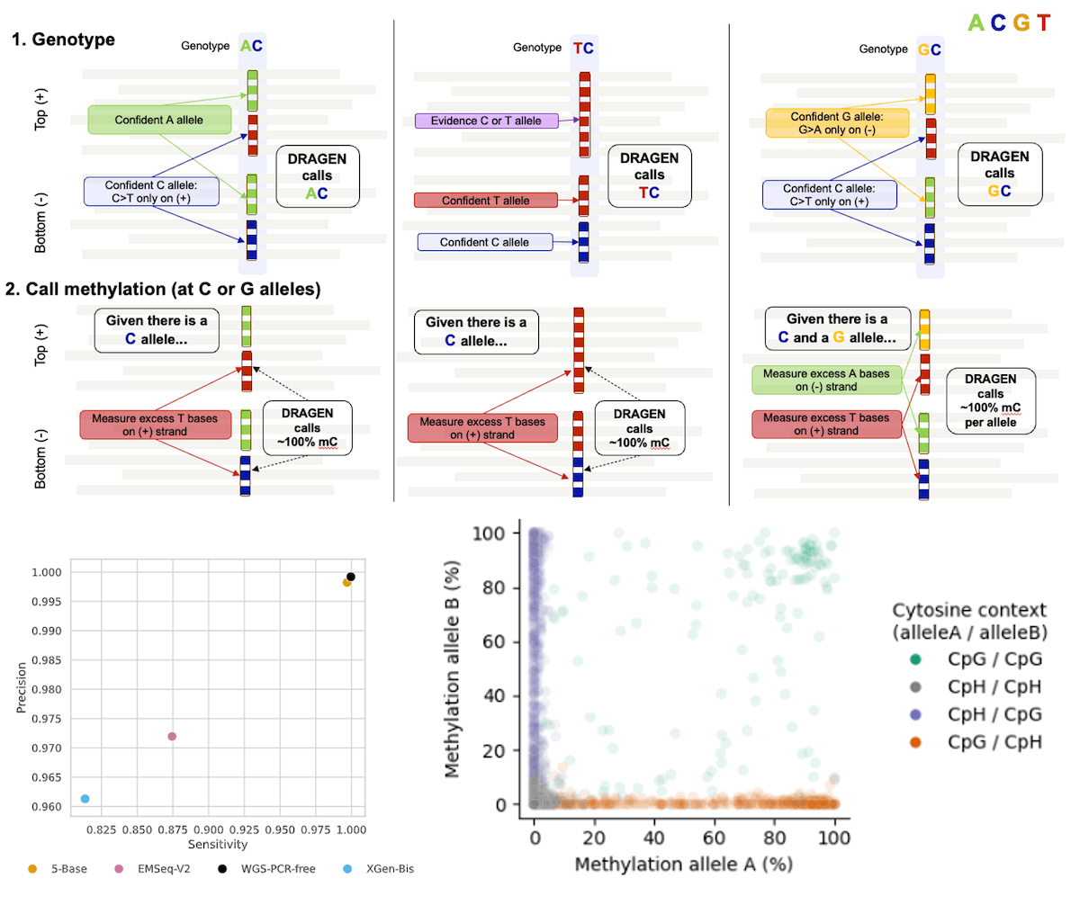 (上图)可能包含甲基化C等位基因的三种杂合子基因型示例。在所有情况下,DRAGEN 5-Base基因分型仪利用两条DNA链的信息检出两个等位基因。基因分型后,通过分别定量(+)或(−)链上的过量C>T或G>A突变,检出每个C或G参考等位基因的甲基化水平。(左下图)因美纳针对NA12878的5-Base解决方案的生殖系SNV检出准确性与WGS(经Bis-SNP处理的EM-seq与重亚硫酸盐测序、经DRAGEN处理的5-Base与全基因组测序)相当。(右下图)在NA12878中发现了杂合子变异(C>G或G>C),这些变异通过改变等位基因胞嘧啶结构(CpG变为CpH,反之亦然)导致甲基化状态发生等位基因特异性变化(紫色、橙色)。例如,G>C的变异会将CGH等位基因转换为CCH等位基因,而该CCH等位基因的CpG结构丢失。