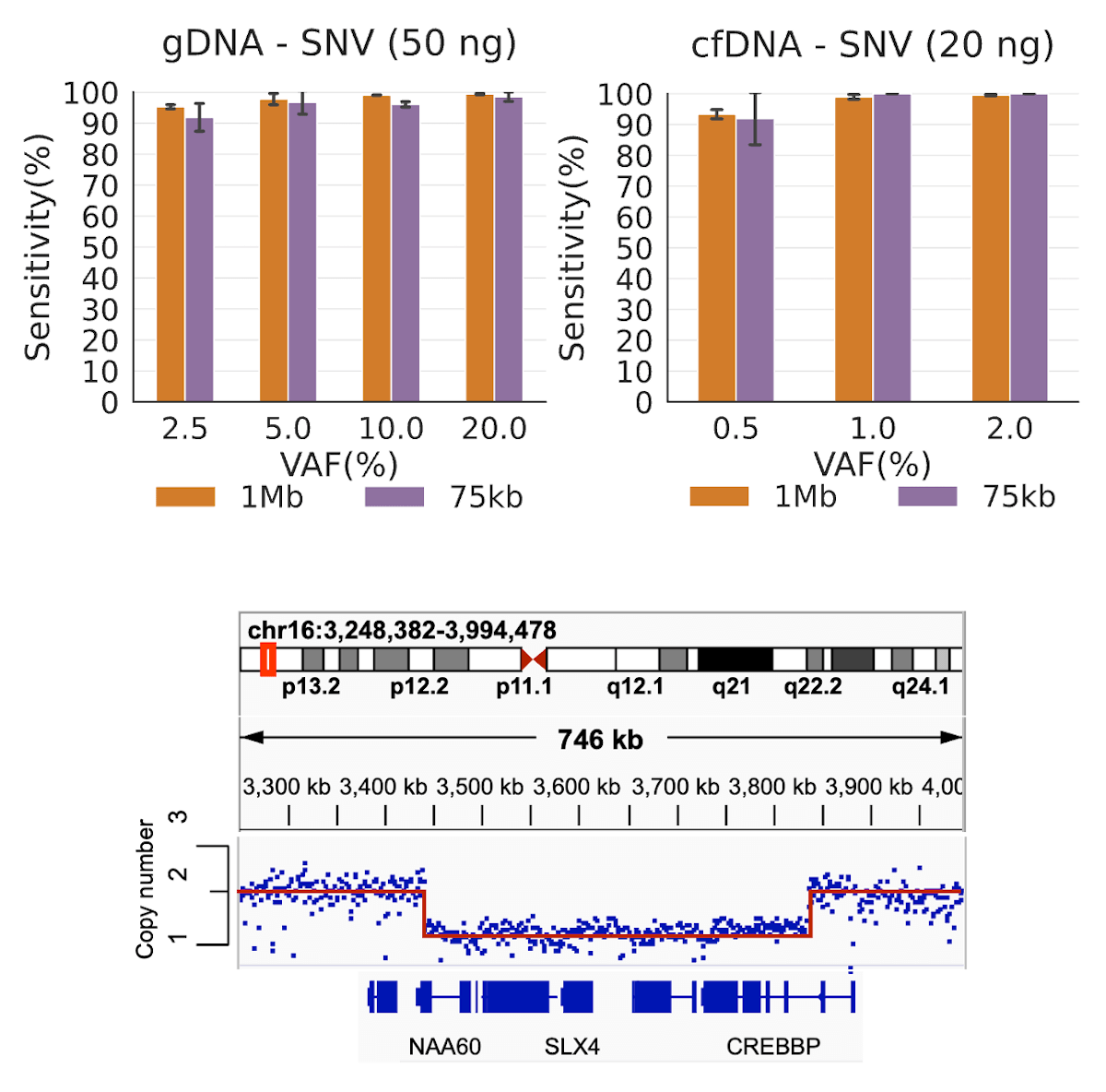 (上图)体细胞SNV检测在各种变异等位基因频率下的灵敏度。(下图)在1例Rubinstein-Taybi综合症患者的CREBBP基因中检测到致病性拷贝数缺失。