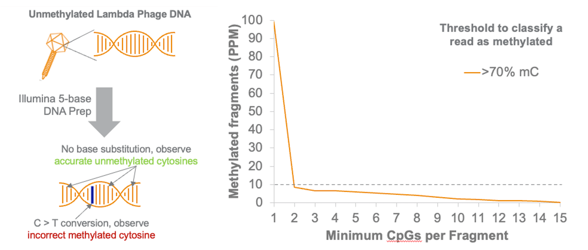 (左图)使用Illumina 5-Base DNA Prep处理未甲基化的Lambda噬菌体DNA并测序。低频C>T错误会导致BAM XM标签中的胞嘧啶碱基被错误标记为甲基化。(右图)仅极少量Lambda噬菌体DNA片段被归类为甲基化(对于包含两个及以上CpG二核苷酸的read对,其比例低于百万分之十)。当read对中超过70%的CpG胞嘧啶碱基被甲基化时,该片段即被归类为甲基化片段。