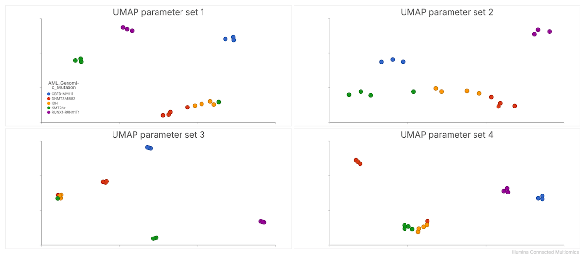 创建样本队列后,用户可以执行探索性分析,例如聚类分析,以可视化队列中的整体差异。Connected Multiomics允许用户基于单个CpG位点以及更大的基因组特征(例如启动子区)进行聚类分析,对于后者,系统会计算这些特征区域内所有CpG位点甲基化水平的平均值。针对分析的生物学或临床环境定制的自定义功能集也可用于增强聚类分析性能。图9展示了用户或团队如何探索不同UMAP参数的聚类分析性能。