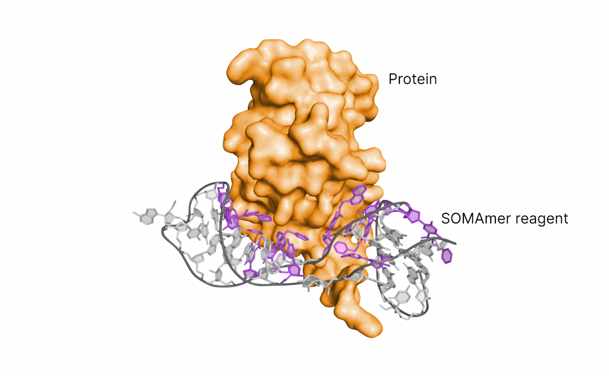 SOMAmer试剂将蛋白质检测与新一代测序(NGS)的成熟可扩展性相结合,实现高精度、高通量蛋白质组学检测。每一种SOMAmer试剂均可结合特定靶蛋白,并携带独特的DNA标签。捕获完成后,这些标签会被转化成测序文库,然后使用NGS平台对测序read进行计数,从而定量蛋白质丰度。这种方法将蛋白质组学转化为高通量的自动化工作流程,能够同时对数千种蛋白进行分析,且检测效率与精准度均可达到科研人员对其他基于NGS方法的同等预期水平。